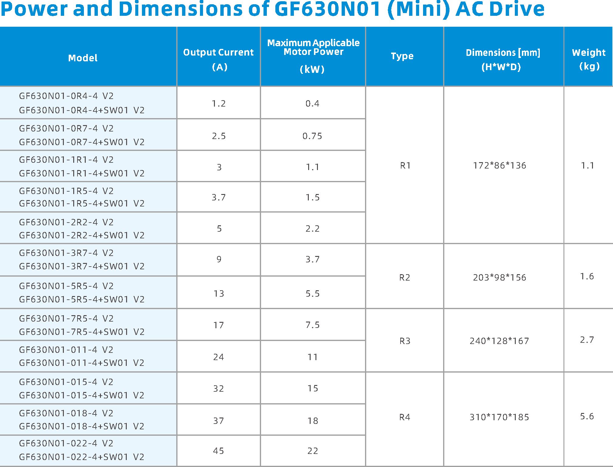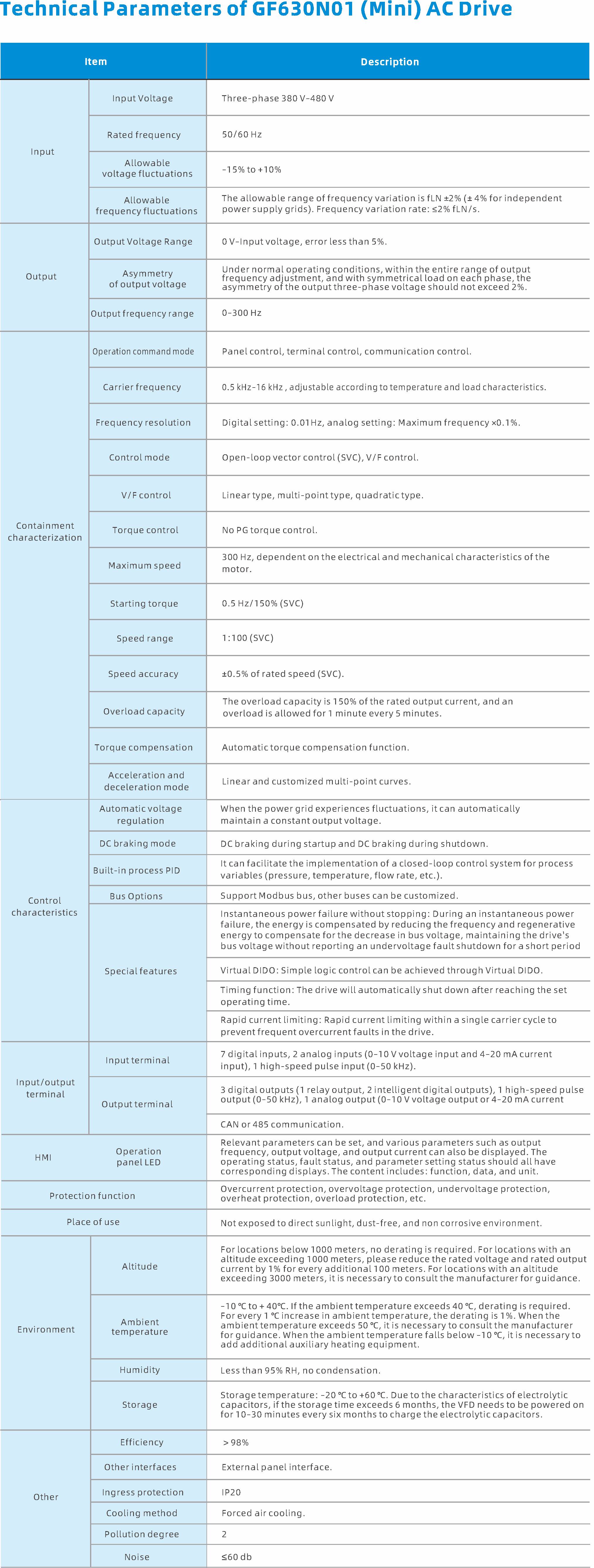 The GF630N01 series mini drive employs vectorized V/F control technology, offering comprehensive functionality in a more compact size. It is suitable for use in industries such as logistics, textile machinery, food machinery, electrical machinery, CNC machine tools, ceramic machinery, rubber machinery, pharmaceutical machinery, printing machinery, and wire drawing machinery.
