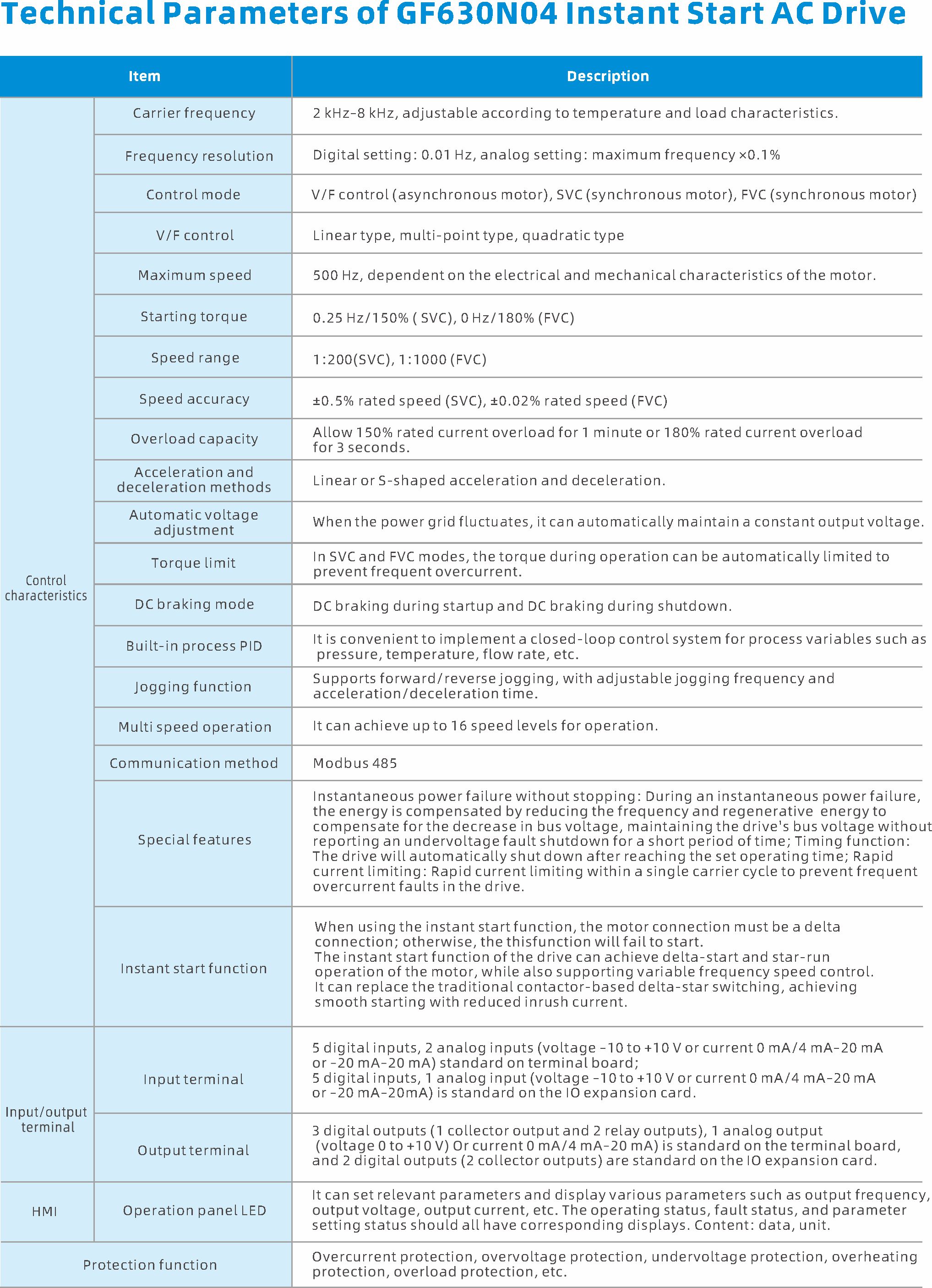 The GF630N04 series instant-start drive is specifically developed for use in the weaving process in the textile industry. Designed to meet the requirements of rapid starting, speed adjustment, inching, and variable-speed weaving operations, it achieves ultra-high multiplicative torque during machine start-up and effectively prevents weft yarn from loosening. The PCB of the instant-start drive undergoes enhanced coating treatment, providing outstanding moisture proof and corrosion prevention, as well as cotton lint and frogging prevention.